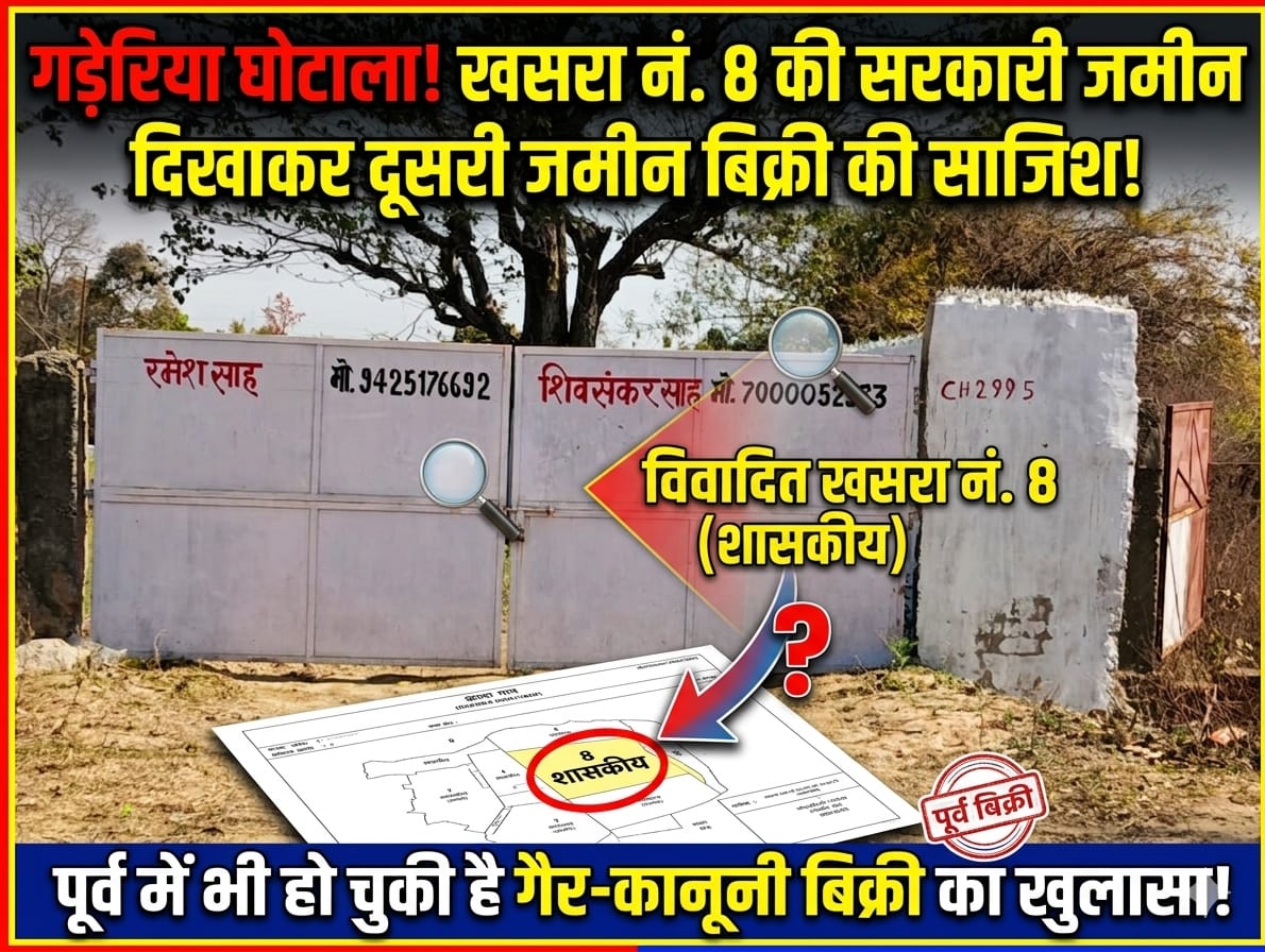 गड़ेरिया की विवादित खसरा नंबर 8 की शासकीय जमीन दिखाकर दूसरी जमीन बिक्री की तैयारी,पूर्व में भी हो चुकी है विक्री, तहसील कार्यालय वरगवां ने जारी किया है बेदखली आदेश। प्रदेश संवाददाता अनुराग द्विवेदी की रिपोर्ट
