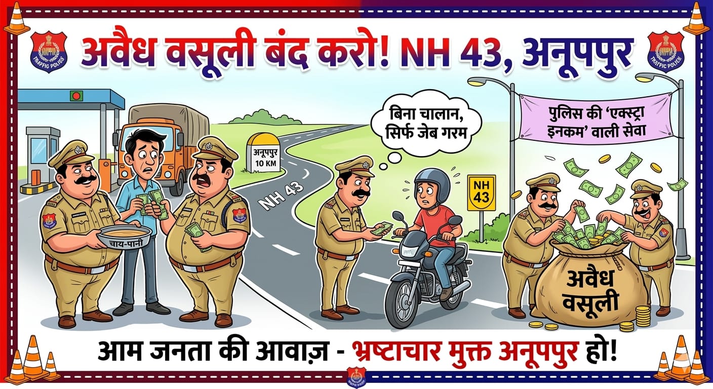 अनूपपुर। राष्ट्रीय राजमार्ग-43 (NH-43) पर यातायात पुलिस की तैनाती इन दिनों सुरक्षा के लिए नहीं बल्कि कमर्शियल वाहनों से अवैध वसूली के लिए की जा रही है। दिन हो या रात, चेकिंग के नाम पर गाड़ियों को रोककर ‘एंट्री’ फीस वसूली जाती है। सूत्रों के अनुसार यह सब यातायात प्रभारी के सीधे संरक्षण में चल रहा है। एक तरफ जहां शहर में शादियों के सीजन में जाम लगा रहता है वहीं पुलिस हाईवे पर वसूली में व्यस्त रहती है जिससे आम जनता को भारी परेशानी का सामना करना पड़ रहा है। हालांकि इसकी कई बार शिकायत भी कुछ अधिकारियों से हो चुकी है!