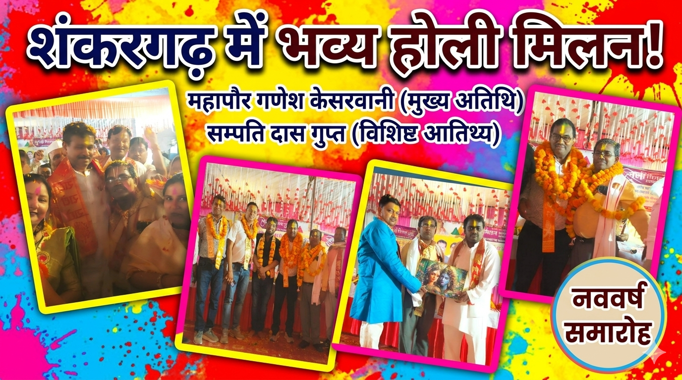 प्रयागराज जिले के शंकरगढ़ में ब्रह्म कुमारी बहनों की उपस्थिति में तथा प्रयागराज के महापौर गणेश के केसरवानी के मुख्य आतिथ्य एवं पत्रकार विकास परिषद के राष्ट्रीय प्रवक्ता सम्पति दास गुप्त एवं चेयरमैन पार्वती कोटार्य व लालपुर डिग्री कालेज के प्रबंधक सूर्य निधान पाण्डेय के विशिष्ट आतिथ्य में आयोजित होली मिलन व हिन्दू नववर्षाभिनंदन समारोह में मध्य प्रदेश व उत्तर प्रदेश के विभिन्न जिलों से पधारे समाजसेवी तथा कवियों ने राष्ट्र व समाज को एक सूत्र में बांधकर राष्ट्र की मुख्य धारा से जुड़कर साहित्य की त्रिवेणी बहाते हुए गुलाल एवं पुष्पों की होली खेलते हुए जो अद्भुत व विहंगम क्षण उपस्थित किया उसके लिए सभी ने मुक्त श्वर से आयोजक व्यापार मंडल तथा संयोजक सुरेश केसरवानी ओम शांति की प्रशंसा करते नजर आए।