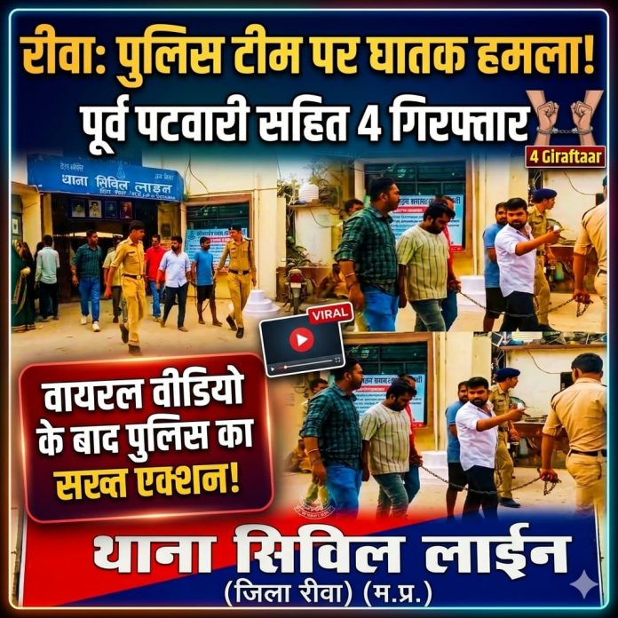 रीवा शहर के सिविल लाइन थाना क्षेत्र में गश्त के दौरान पुलिस टीम पर हुए हमले के मामले में पुलिस ने त्वरित कार्रवाई करते हुए पूर्व पटवारी सहित चार आरोपियों को गिरफ्तार कर लिया है। घटना का वीडियो सोशल मीडिया पर वायरल होने के बाद पुलिस महकमे की जमकर किरकिरी हुई, जिसके बाद पुलिस ने रातों-रात आरोपियों को चिन्हित कर दबिश देते हुए उन्हें गिरफ्तार कर लिया।