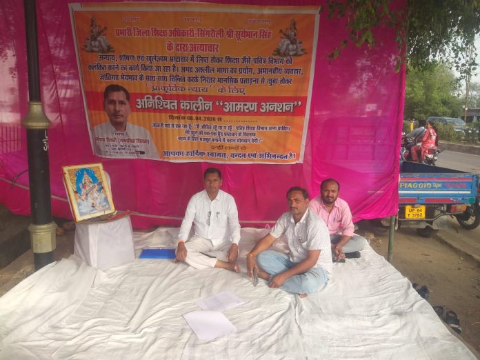 सिंगरौली में शिक्षा विभाग के खिलाफ आमरण अनशन शुरू, जिला शिक्षा अधिकारी पर भ्रष्टाचार और शोषण के लगे आरोप।। कुंडेश्वर टाइम्स प्रदेश संवाददाता अनुराग द्विवेदी की रिपोर्ट