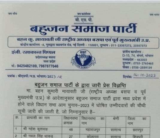 बसपा ने जारी की मध्य प्रदेश विधानसभा प्रत्याशियों की चौथी सूची देवतालाब से अमरनाथ पटेल को बनाया प्रत्याशी ।। कुंडेश्वर टाइम्स ब्यूरो प्रमोद सिंह...